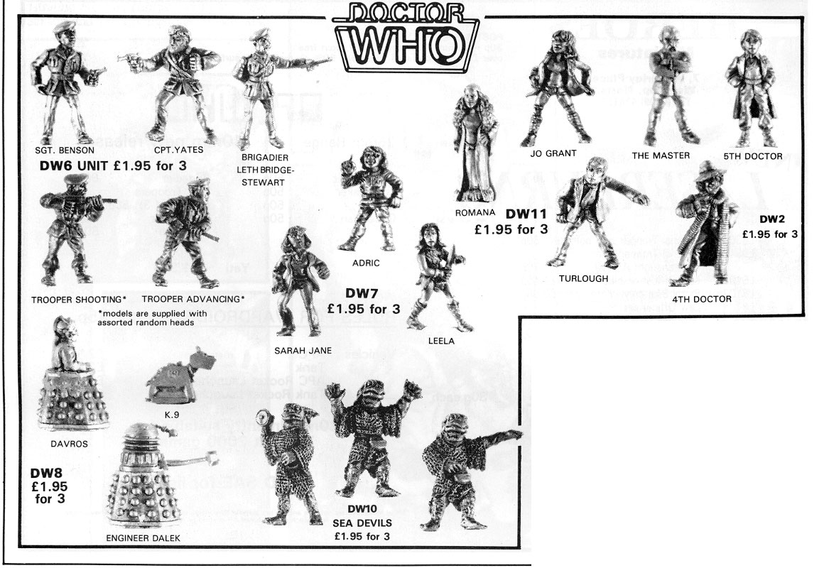 Dr Who - DW2 The Master, 4th Doctor, 5th Doctor; DW6 UNIT; DW7 Adric, Sarah Jane, Leela; DW11 Romana, Jo Grant, Turlough DW8 Davros, K-9, Dalek Engineer; DW10 Sea Devils