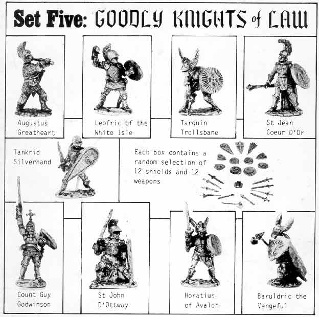 There were apparently 2 versions of the Knights of Law, The Goodly Knights and the Warrior Knights. The second set was also briefly listed as SS5a Warriors Knights of Chaos in the Arcane Listings, they underwent a change of alignment before Compendium 2 was published, the listed names are the same.