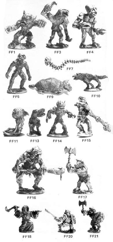 FF1 The Fiend, FF3 Crabman, FF4 Hook Horror, FF5 Phantom Stalker, FF7 Death Worm, FF9 Carbuncle, FF10 Devil Dog, FF11 Grell, FF13 Bonesnapper, FF14 Cyclops, FF15 Hill Giant, FF16 Giant Troll, FF17 Minotaur, FF18 Wraith, FF20 Goblin with Sword, FF21 Goblin with Axe, FF28 Red Orc in Chainmail on Giant Tusker, FF26 Red Orc in Plate, FF37 Warrior of the Stone, FF40 Berserker, FF43 Salaman Warrior with Pike, FF47 Elite Salaman Trooper on Giant Strider