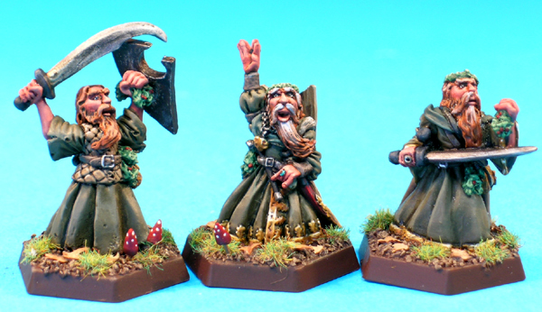 This trio of figures represents a male human Druid player character as he progresses from being a humble servant of nature to a wise and powerful sage of the wilderness.