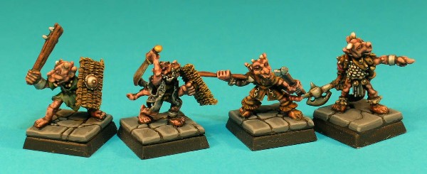 Pose 2, variant E. This figure is armed with a shortsword. He has small, sharp horns, large ears and a sneering mouth with a short muzzle.