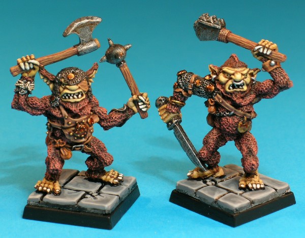 Pose 1, variant B. This variant figure has a pointed beard and an open mouth showing his vicious fangs and a protruding tongue. He has long ears, his left one is upright and his right looks a bit limp, and wears a fine chain nose-ring. His head looks straight forwards, and he is armed with a studded wooden club in his right hand and a notched cleaver in his left.