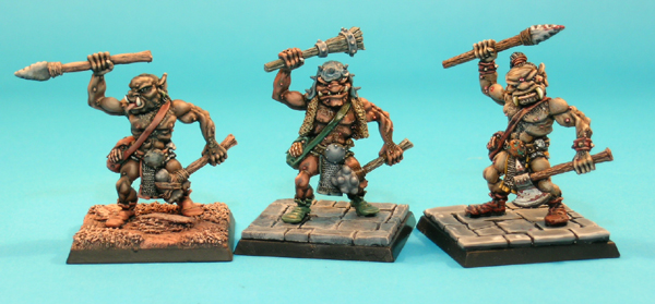 Variant C. This figure wears a loin-cloth with a chainmail front flap, a fur waistcoat and a shoulder bag. He wields a steel-banded wooden club in his right hand and carries a studded ball-mace in his left. He is looking forwards, and wears a leather hood or hat with spikes protruding from it. He has a partly-open, grinning mouth with lower fangs on show.
