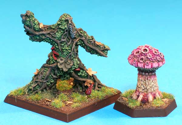This set of figures represents a Shambling Mound, a huge magical creature made of rotting vegetation which dwells in fetid swamps, and a Shrieker, a semi-mobile fungus renowned for the piercing scream it emits when disturbed by movement or lights. Each pack contained one of each figure, and no variants were made.