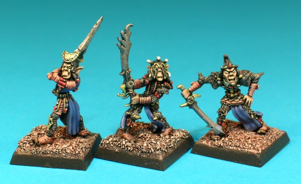 This set of figures represents a trio of Githyanki, otherworldly psionic warriors from the Astral Plane. They were sold in packs of 3 different poses, with 5 variants of each miniature (but look out for the unusual 'sub-variant' in pose 2). The only differences seen are in headwear and facial features
