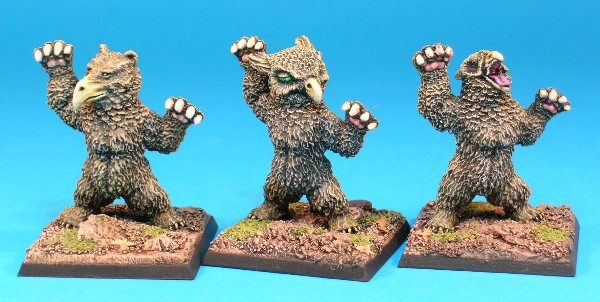 These figures were designed to represent Owlbears, freakish hybrids of bears and owls bred for unknown purposes by a deranged wizard. As with the ADD59 Trolls, ADD77 Umber Hulks and ADD86 Minotaurs, they were cast as two-piece models with identical bodies and variant heads. There were four variant heads made.