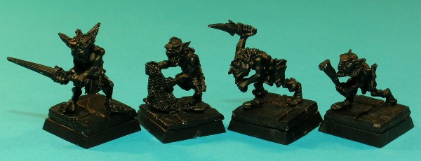 This set of figures depicted some of the low-level dungeon lowlife featured in the Fiend Folio, an AD&D monster supplement published by TSR UK in 1981. They were sold in blister packs containing 4 figures, a Meazel, a Xvart, a Snyad and a Mite. Strangely, there were 2 different Meazel poses (with garotting cord or two-handed sword) and 3 different Xvarts (with net, sword or axe.) Each figure seems to have had 5 variants, for a total of 35 different castings in this code! The only variant details of each pose seem to be in head and facial features.