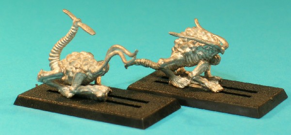 These two figures were designed to represent Rust Monsters, bizarre dungeon-dwellers with a taste for the arms and armour of high-level Fighters! They were sold in packs of 2 different models, and both are 3-piece castings. The leg pieces seem to be identical, but the 2 body sections are different. No variants were made in this code.